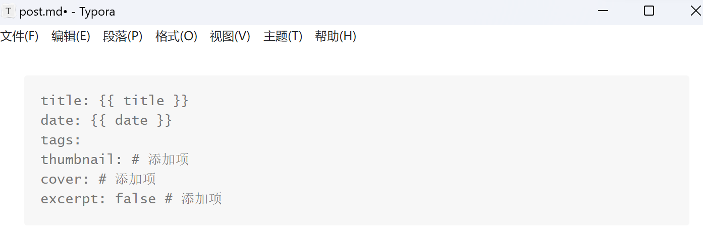 hexo new 新文章,文章页的front matter中只有titile,date,tags三项内容,一般情况下新建文章包含首页缩略图,文章页头图,不希望出现文章摘要信息。